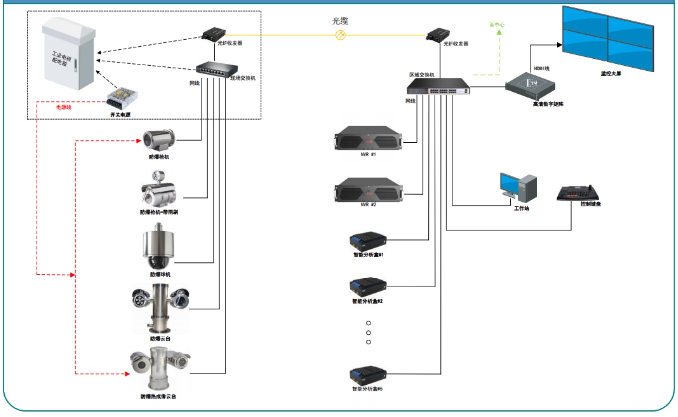 针对于全厂的安保区域,以及特殊和高危区域等场景,配置多台32路智能AI分析盒,安装在各个区域的机柜内。智能AI分析盒采用国际领先的AI识别算法技术、人工智能和现代化网络技术。基于先进的深度学习算法,根据人脸、人体、物品等的生物特征,定义各种异常行为,从而判断出画面中是否存在异常。已经封装100多种算法包括:环境安全,人员穿戴安全,人员行为安全,车辆安全,交通事件检测,水利安全,输煤皮带;烟火识别;设备跑冒滴漏识别。告警信息和视频可显示在监控客户端界面,也可将报警信息推送到移动端。同时联动工作站的警灯和警号提示用户及时处置。